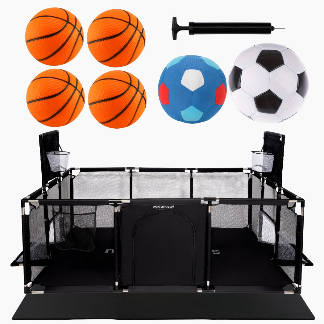 Our playpen is designed for children from 0 to 36 months . Even at a young age, babies can safely explore by pulling themselves up using the built-in support rings, helping them develop strength and balance. As they grow, the integrated soccer goals and basketball hoops encourage active play, improving their coordination and motor skills in a fun and engaging way